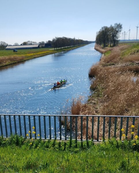 Rond acht uur gingen we van start in een C4X+, op weg naar de eerste sluis, een grotere sluis waar ruimte was voor alle 7 deelnemende boten. De sluis liet ons een meter zakken, en wij konden het rechte stuk op naar Lelystad. In dat rechte stuk zaten toch wel wat flauwe bochten en het was een erg mooi stuk roeien langs bosrijk gebied. Niet de big 5 gespot onderweg, maar gelukkig hadden de ganzen, wat gezinsuitbreiding betreft, flink hun best gedaan.
