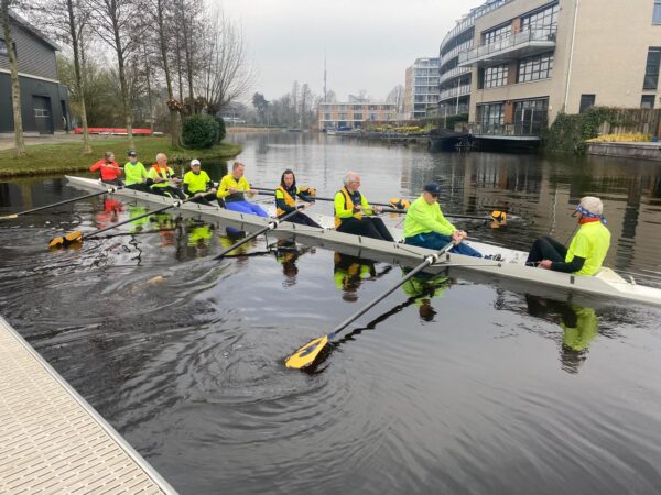 Uit de dinsdagochtendgroep kon eindelijk dan toch een mixed acht worden gevormd. Het veilig naar buiten brengen was nog wel wat onwennig en vroeg extra aandacht. Eenmaal aan boord en bij de eerste slagen won het enthousiasme het van de onwennigheid. Rutger moest zeker ook wennen aan de krappe stuurplek. Een volgende keer misschien een schoenlepel of wat vaseline meenemen.