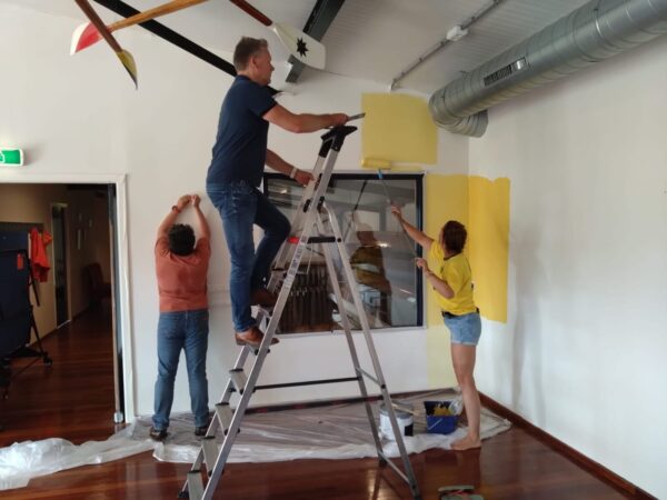 Er werd op dag 1 gestart met een lekker stukje zelfgebakken appeltaart van Plonia, en daarna kon iedereen er flink tegenaan! Er werd direct al heel veel werk verzet. De muren werden voorzien van een lichte tint Iris-geel, de vloer kreeg een opknapbeurt door middel van een nieuwe waxlaag (wat een werk!!) en de verlichting werd vervangen voor sfeervolle, maar vooral ook duurzame varianten. Het terras-meubilair kreeg spontaan een nieuwe look en de oude kapotte bank maakte plaats voor een nieuwe zithoek.
