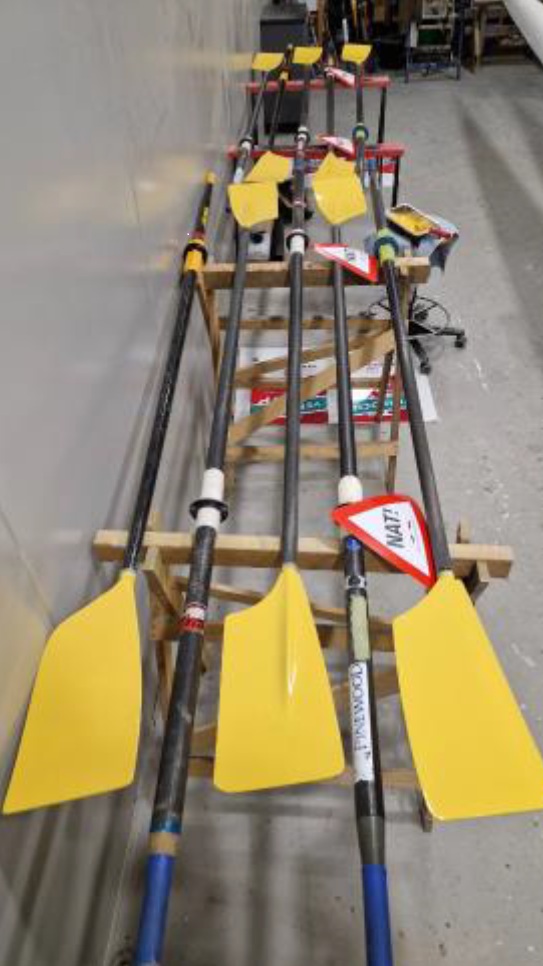Binnen onze vereniging zijn veel vrijwilligers actief die ervoor zorgen dat alles blijft draaien. Eén van die enthousiaste groep vrijwilligers is Schuurfeestje, een subcommissie binnen de kluscommunity die zich bezighoudt met het schilderen van de bladen van onze roeiriemen.